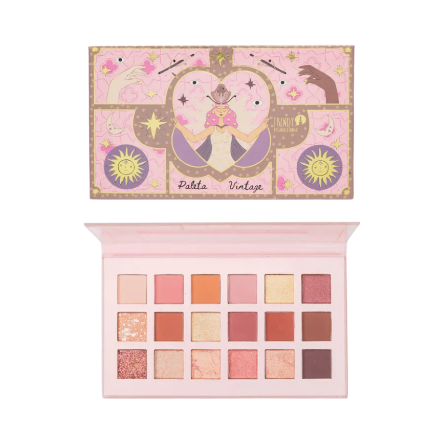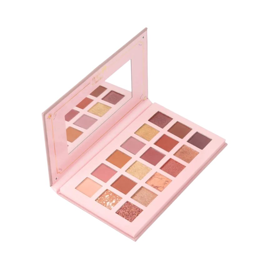 Paleta de sombras con 18 tonos entre mates y satinados. Tonos magentas, vino, marrones rojizos y rosa de acabado matte, otros satinados de alta pigmentación en tonos dorados, rosa y un pigmento tipo glitter en tono vino.